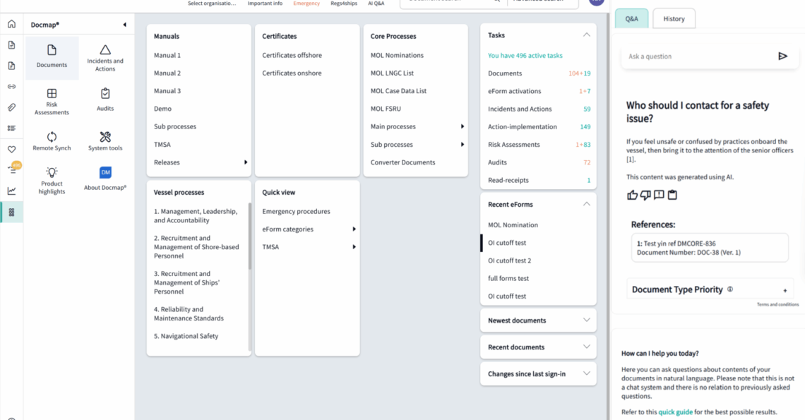 By consolidating QHSE data, Docmap enables both shoreside and onboard teams to access the latest safety protocols and records.