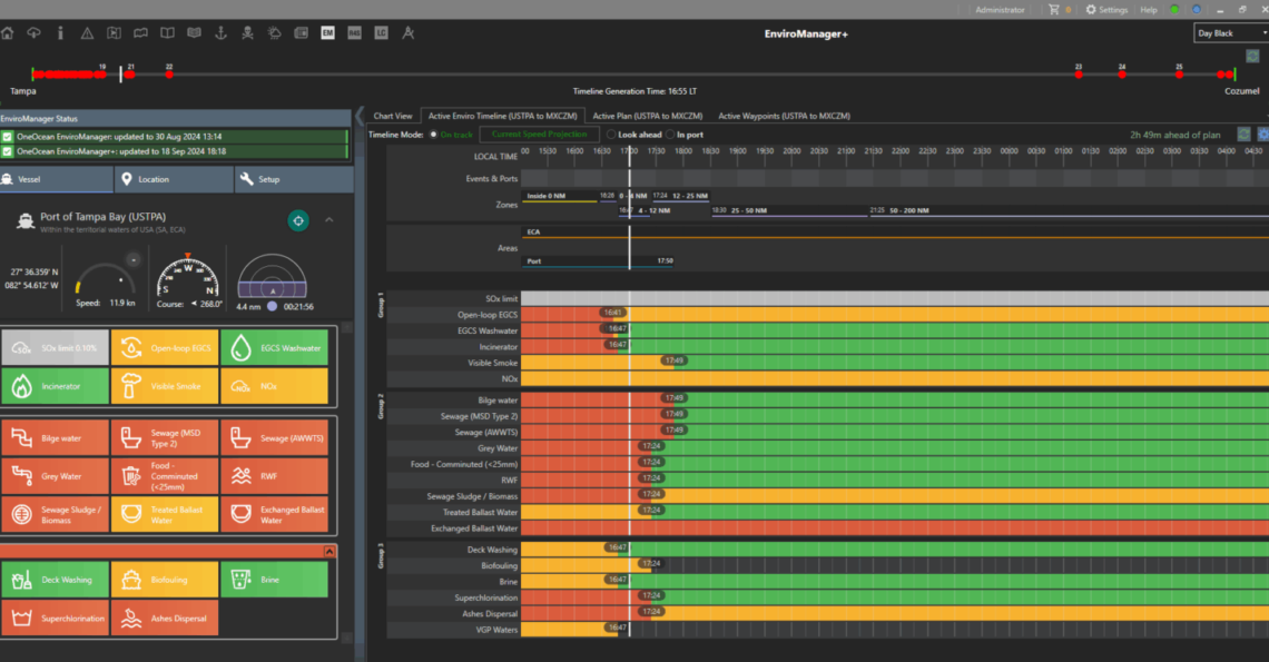 Weather shifts, routes change, and so do regulations. EnviroManager+ keeps teams up to speed with live updates, instant ship-to-shore sync, and a dynamic compliance timeline on board that adjusts with the vessel’s position and speed. Crews can visualise upcoming regulatory changes on a rolling 12-hour display – from permissible discharges to special areas – reducing planning time, supporting informed decisions, and keeping a clear compliance record.
