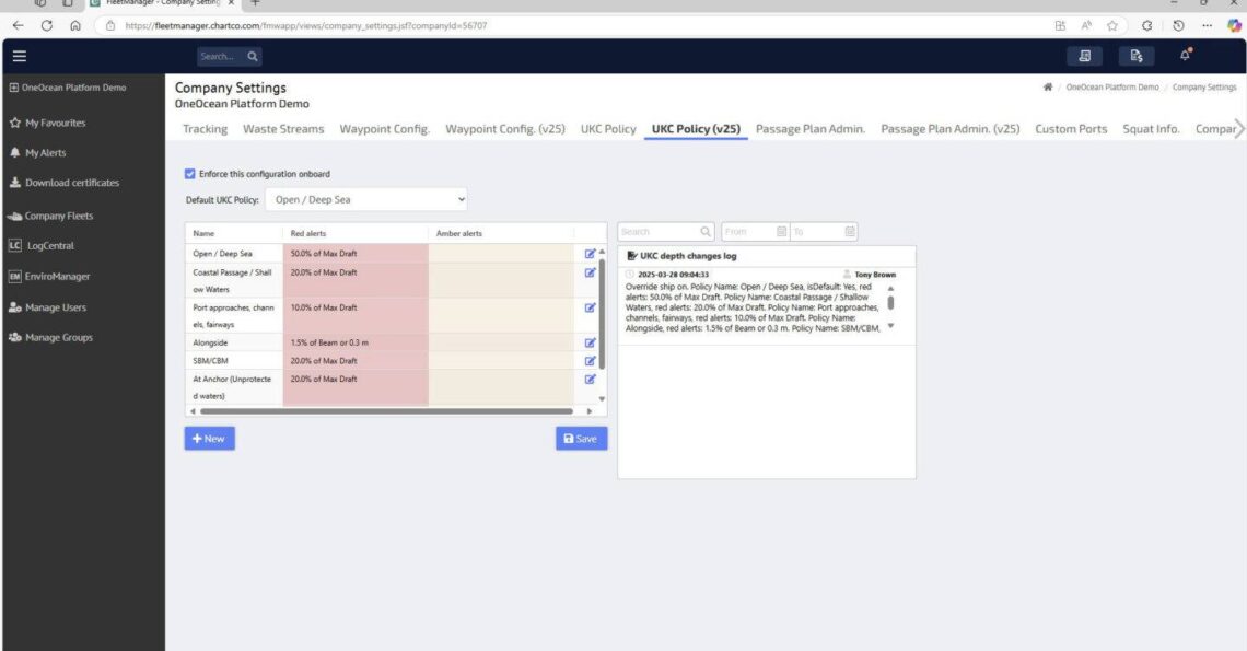Shoreside teams can configure fleet and vessel settings centrally and deploy them across operations within minutes. Passage plans, safety parameters, and equipment configurations can all be managed, including under keel clearance requirements, waypoint tables, and tailored policy settings. Ensuring every voyage plan created in PassageManager starts from a consistent, company-approved foundation. The result is greater control, uniform operations, and reduced risk across every vessel.